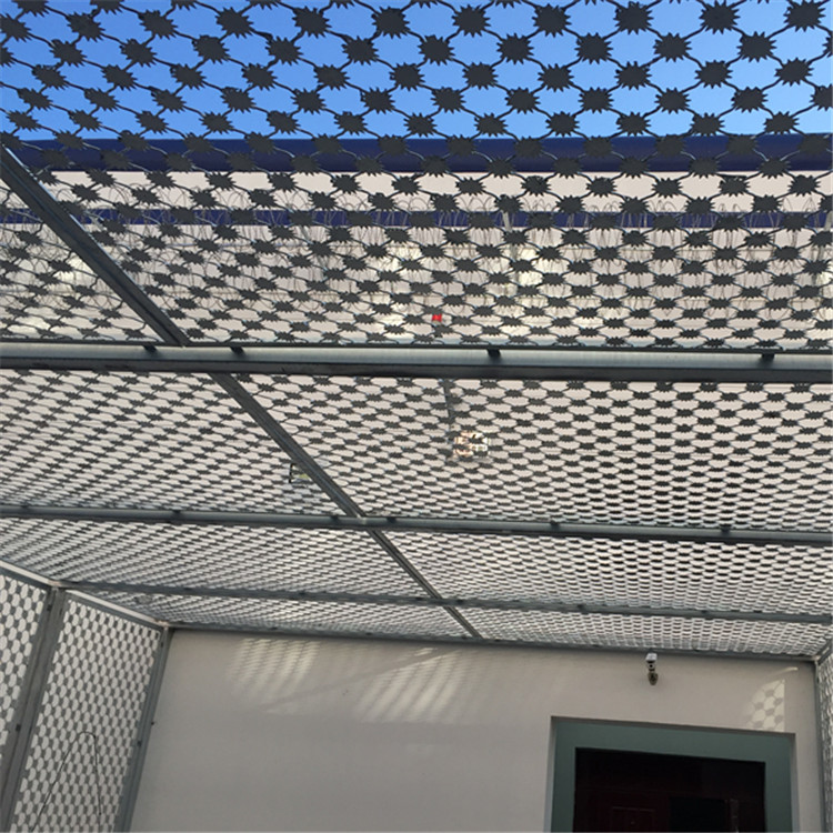 5、刀片滾網(wǎng)、拉絲、卡扣,均采用不銹鋼材質(zhì)。刀刺網(wǎng)安裝固定卡扣整體調(diào)正,使刀刺網(wǎng)不出現(xiàn)擰轉(zhuǎn)情況,刀刺刺圈分布均勻,每隔30-40cm與拉絲固定;分段連接處需將兩端刀刺網(wǎng)做連接固定,刀刺網(wǎng)固定點需緊鎖不得出現(xiàn)松動、脫落現(xiàn)象;刀刺網(wǎng)安裝與隔離網(wǎng)平行,上下左右均成直線延伸,轉(zhuǎn)角處需做加密加固處理。