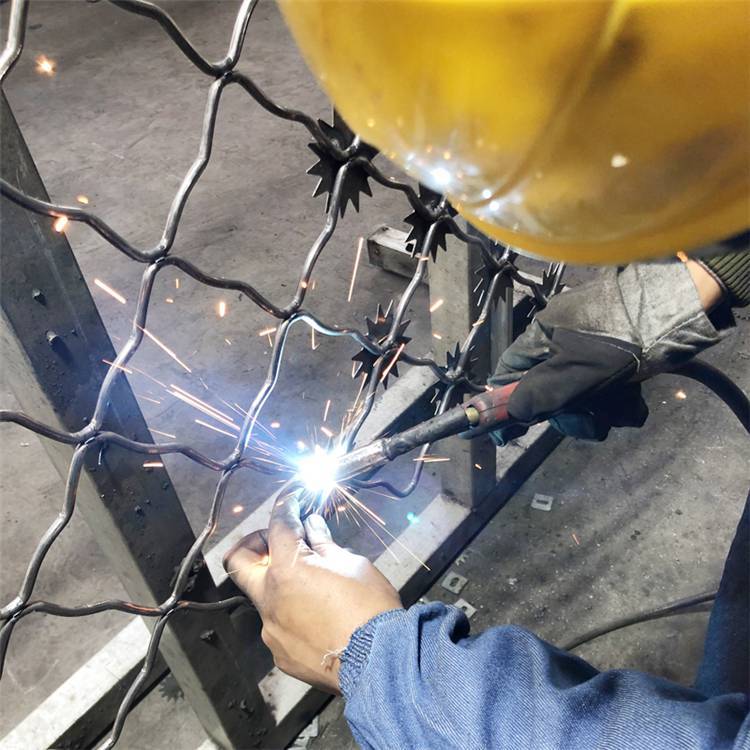 1、太陽花刺片:太陽花刺片直徑一般不小于7.5cm (直徑6cm、7cm、8cm) , 刺片厚1.5mm,采用Q235低碳鋼板沖壓成型。太陽花剌片用氬弧焊將太陽花形刺片焊接在美格網(wǎng)的節(jié)點(diǎn)上,形成刺形保護(hù),有效的防止了手握腳攀。