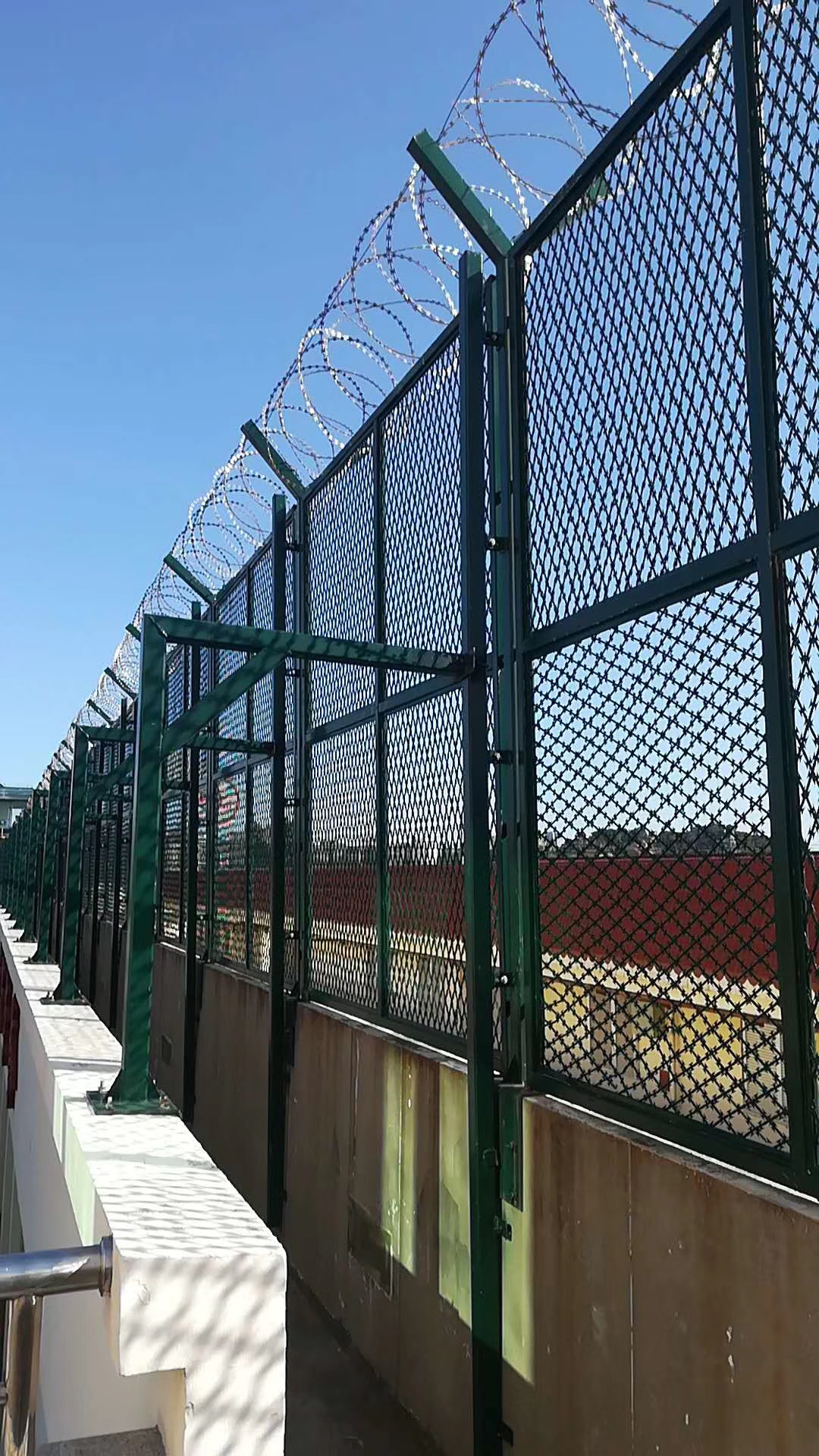 表面處理:表面鍍鋅后浸塑 。在監(jiān)獄內(nèi)距離獄墻5m處設(shè)置防攀爬金屬隔離網(wǎng)。根據(jù)防攀爬金屬隔離網(wǎng)的設(shè)計要求,采用立式Y(jié)式型.柱、鋼絲網(wǎng)加蛇腹型刀刺網(wǎng)。